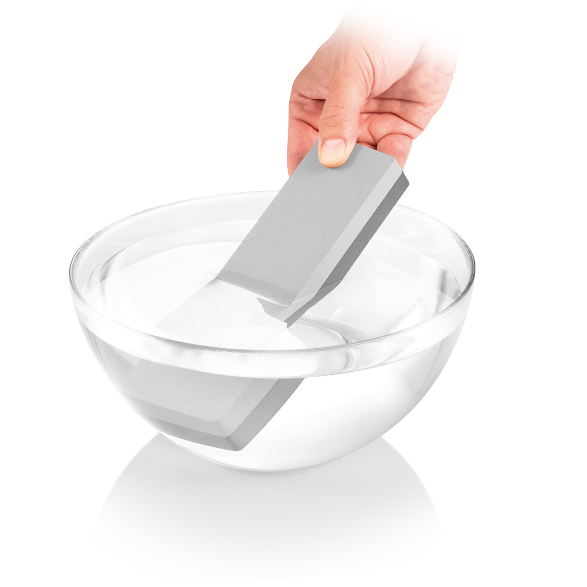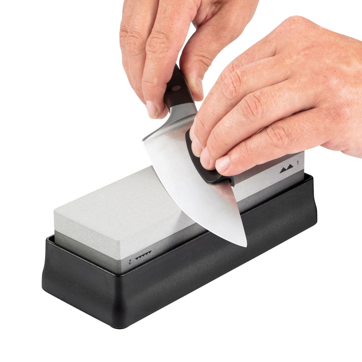 Ceramic stone with two sharpening areas for coarse and fine sharpening of metal knives with plain cutting edge. Stone grit size J600 and J2000, plastic holder with anti-skid treatment and angle guide with ceramic rollers for safe use. Instructions for use enclosed. 3-year warranty.