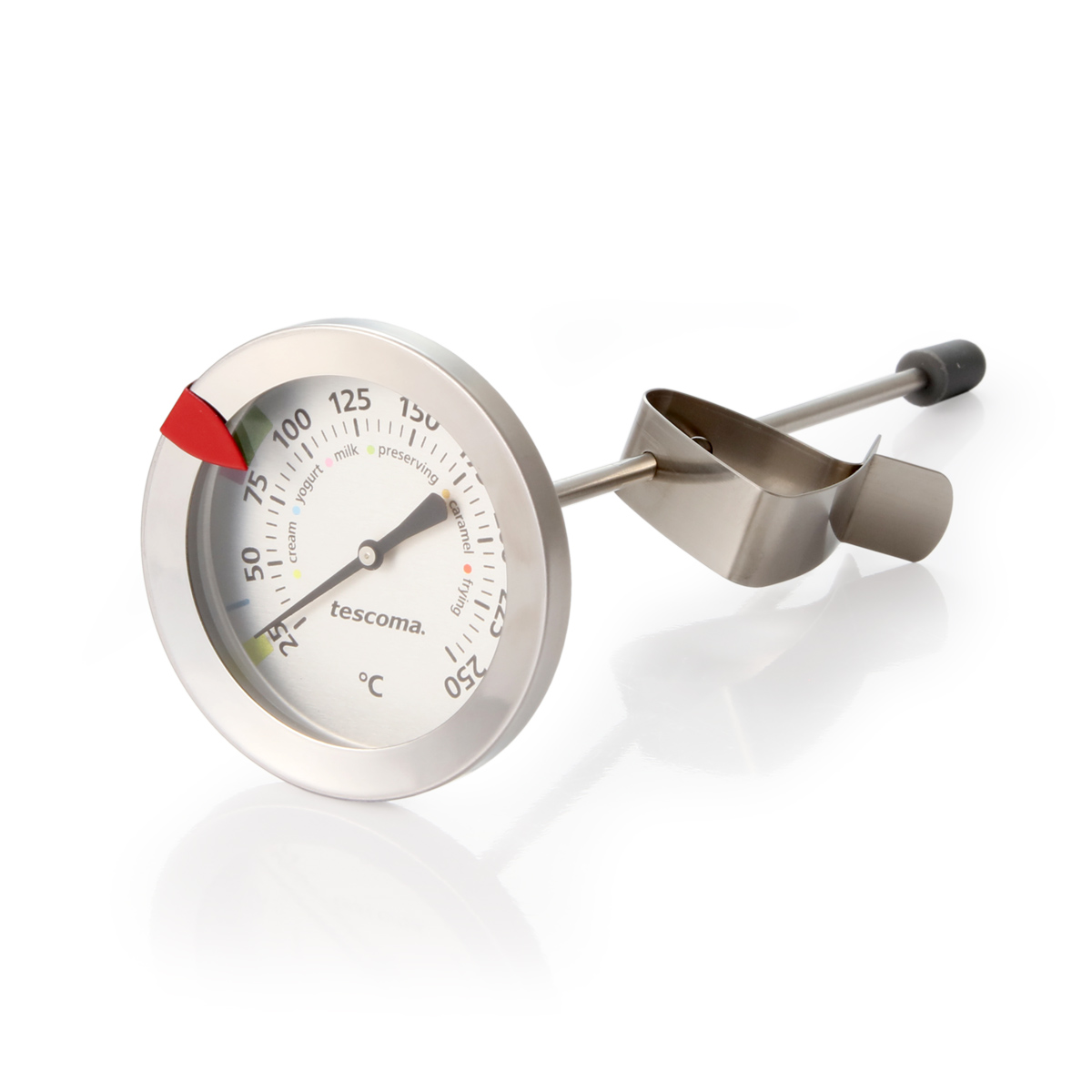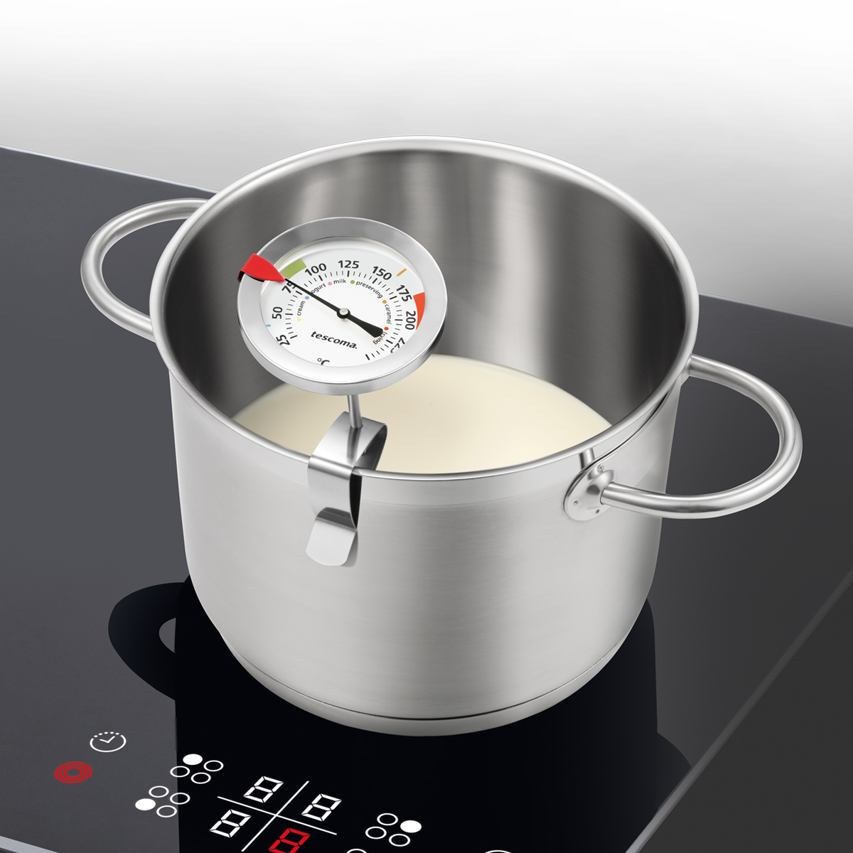 Excellent for easily inspecting the temperature of food in cooking, deep frying, preserving food, etc. With a clip for hanging the thermometer on the rim of cookware and with a protective guard for the probe. Face showing the most common temperatures to be observed and a moving mark. Made of high-grade stainless steel, resistant glass and silicone. Clean under running water, do not wash in dishwasher. 3-year warranty.