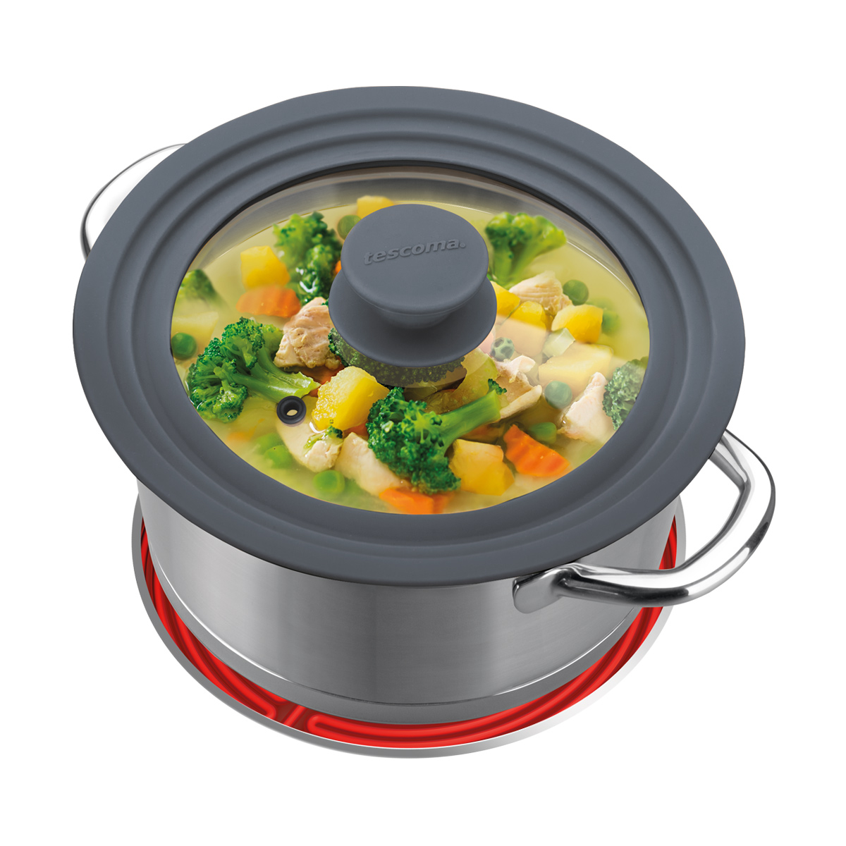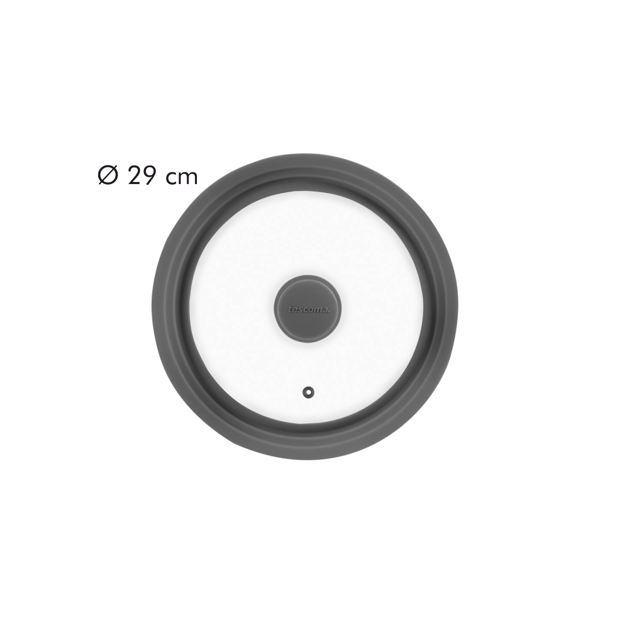 Universal cover for cookware and frying pans TESCOMA ¤ 24, 26 and 28 cm. Made of resistant glass and heat-resistant silicone. Suitable for baking ovens (max. 200 °C). 3-year warranty.