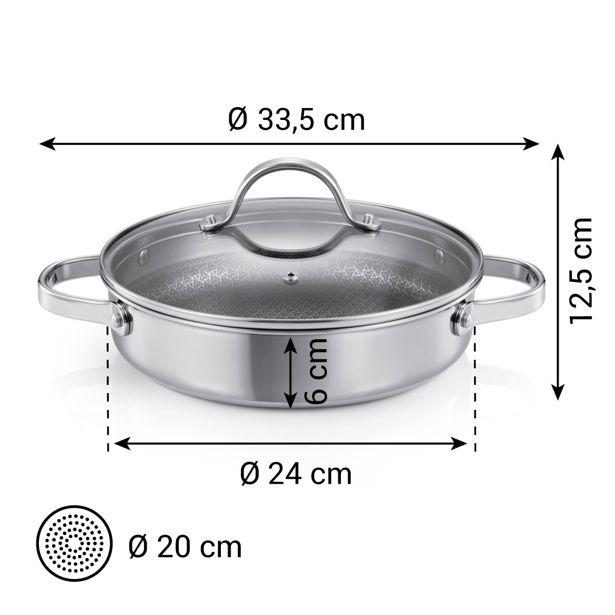 Luxurious stainless steel cookware with a solid glass/stainless steel cover and opening for steam The revolutionary non-stick coating with steel grid is resistant to metal kitchen utensils. Suitable for all types of cookers including induction cookers. Can be used for roasting in the oven. 5-year warranty.