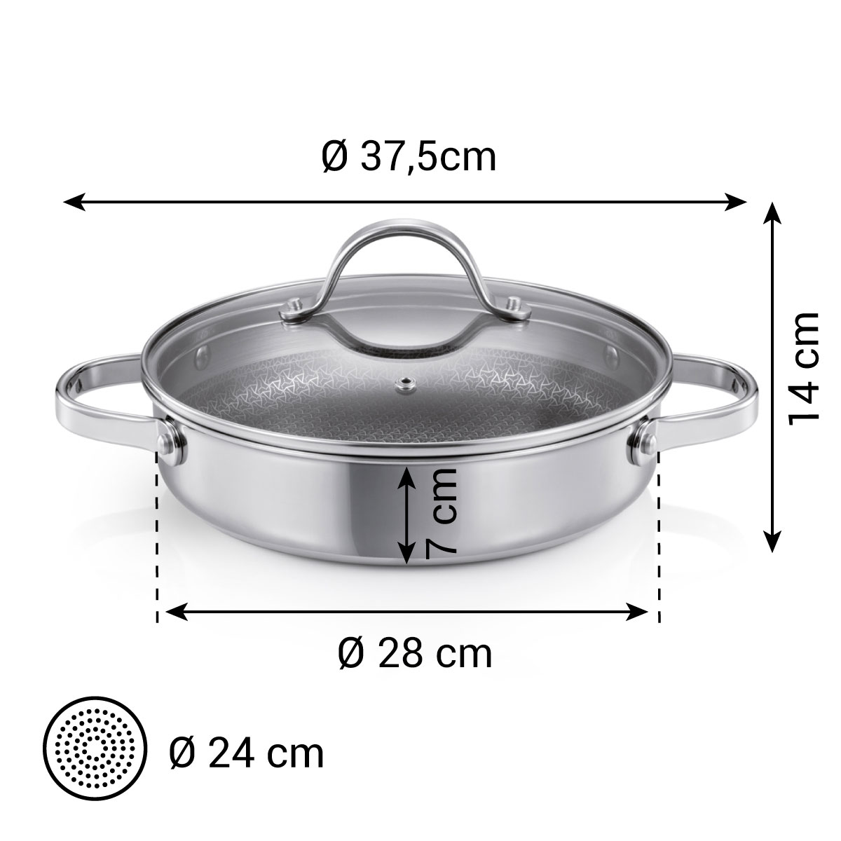Luxurious stainless steel cookware with a solid glass/stainless steel cover and opening for steam The revolutionary non-stick coating with steel grid is resistant to metal kitchen utensils.