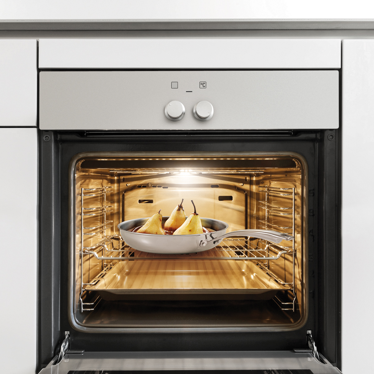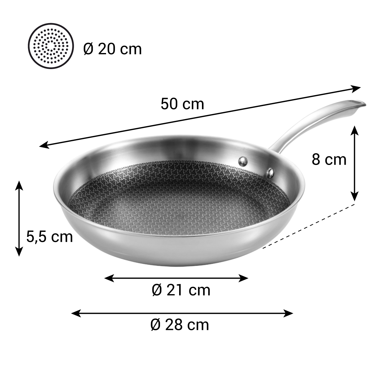 Luxurious frying pan made of layered high-grade stainless steel with revolutionary non-stick coating provided with a steel grid for frying intensely and evenly without overcooking. Resistant to metal kitchen utensils, suitable for all types of cookers including induction cookers and for cooking in an oven. Easy to clean. 5-year warranty.