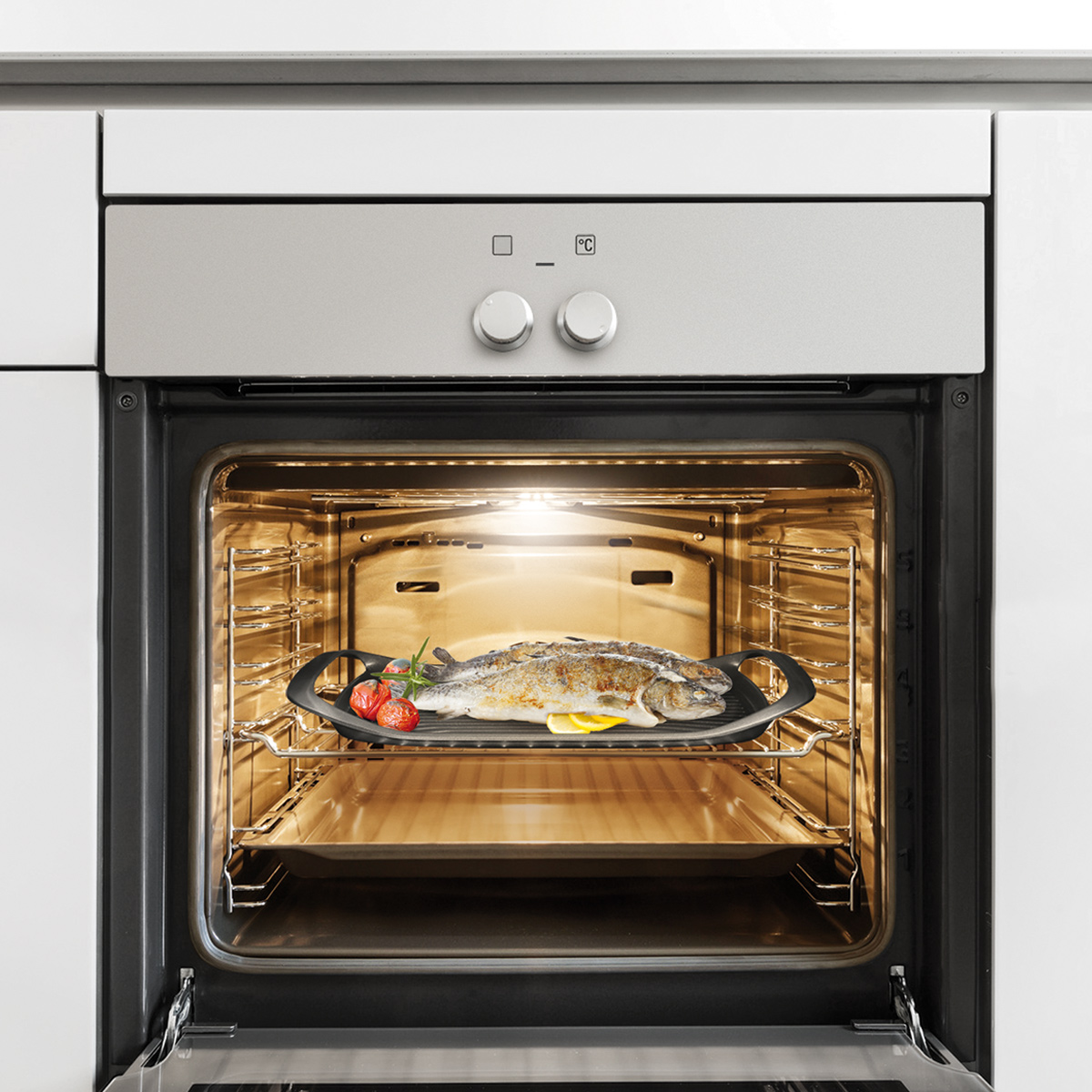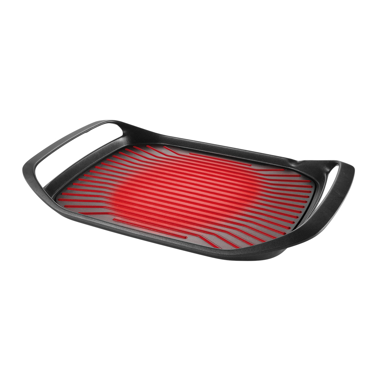 Spacious frying pan with heat-resistant silicone grips excellent for grilling and serving food. With 2 thermal zones: the centre of the grilling pan for intense grilling, the sides for finishing and keeping food warm. First-class non-stick coating against overcooking and stainless steel induction bottom suitable for all types of cookers. Dishwasher safe. 5-year warranty.