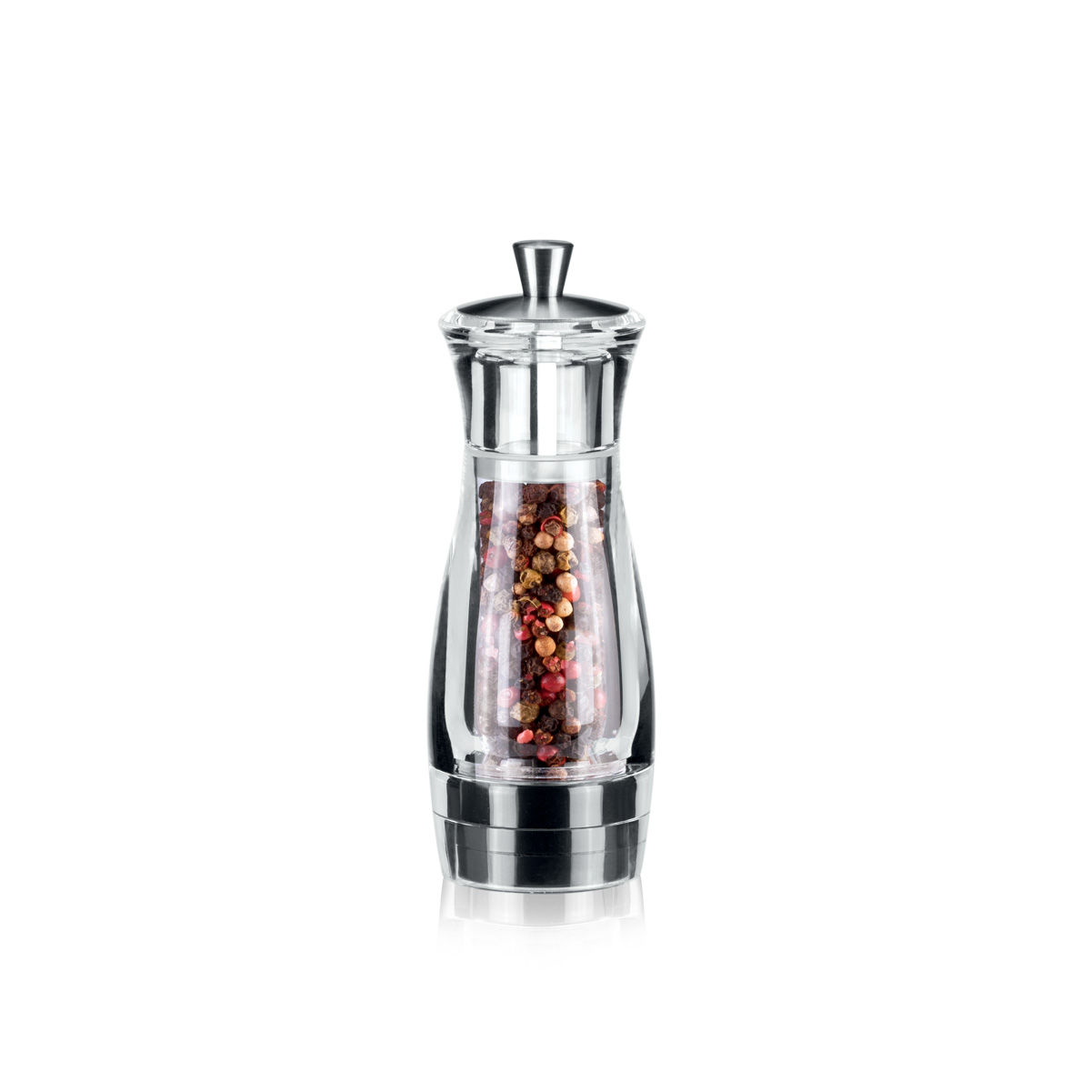 Excellent for easily seasoning food with fresh milled pepper. Featuring an excellent ceramic milling mechanism with adjustable coarseness. Made of durable transparent plastic and stainless steel. Clean with a moist cloth and dry. Do not wash in the dishwasher. 3-year warranty.