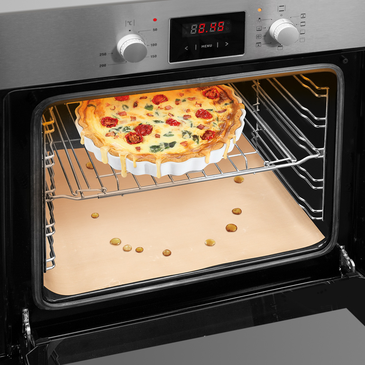 Protects the bottom of the oven against soiling charred and greasy dirt can be easily washed from the non-stick surface of the mat. Made of heat-resistant synthetic fabric with first-class non-stick coating, resistant to 260 °C. Reusable, suitable for electric, hot-air and microwave ovens.