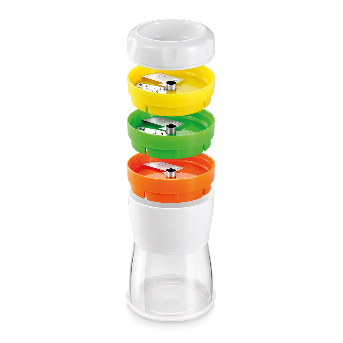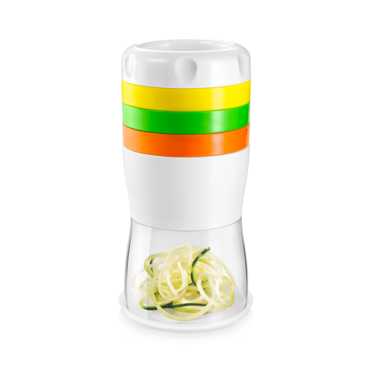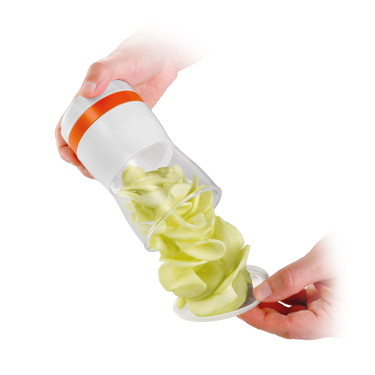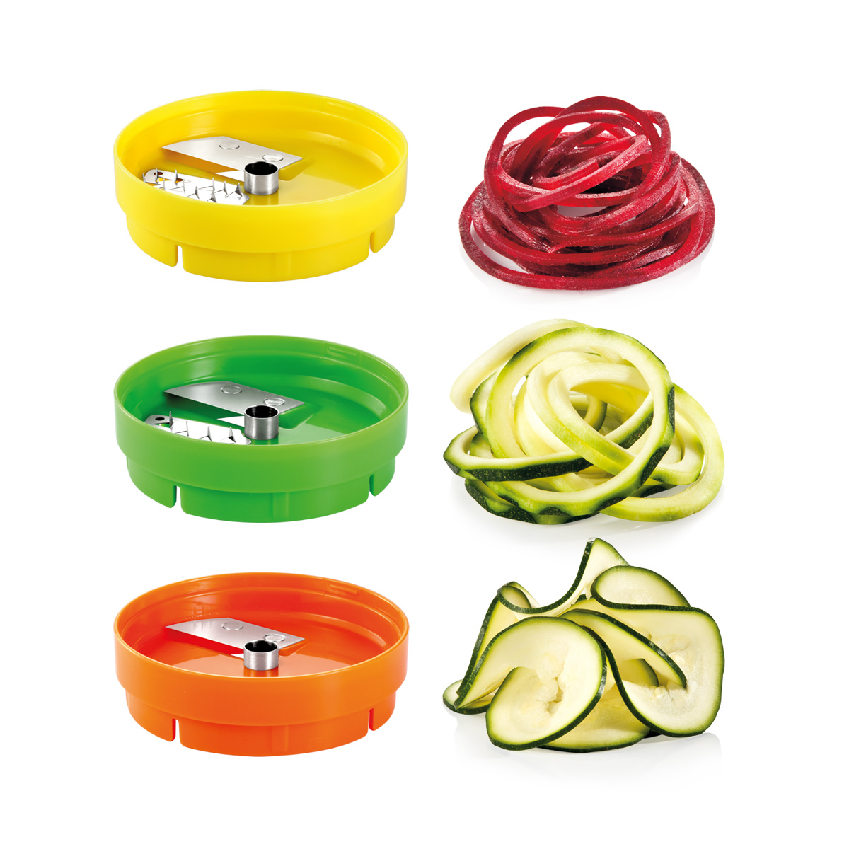 Excellent for preparing thin noodles, spaghetti and spiral chips from carrots, cucumbers zucchinis, white radishes, beetroots, potatoes, apples, etc. With 3 blades made of high-grade stainless steel and protective handle for easily cutting without any residues. Dishwasher safe. 3-year warranty.